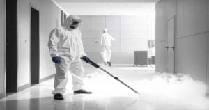 続いて 細菌・ウイルス・虫卵を専用薬剤で処理。あわせて 再繁殖抑制を施工。